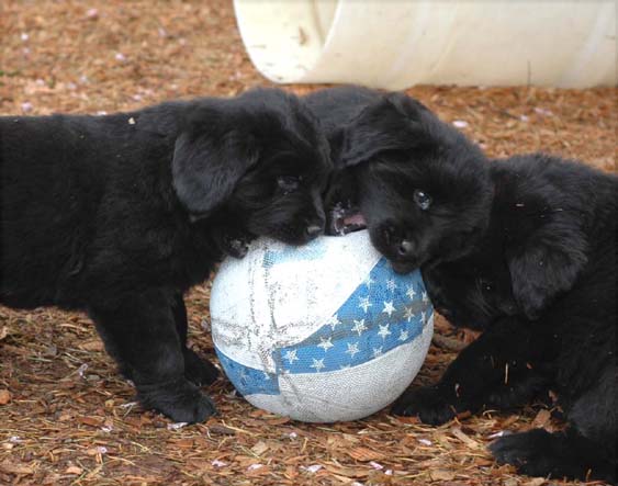 The shavings pile is still the favorite hangout. The adult Newfs occupy the summit, and the pups hustle to join them.